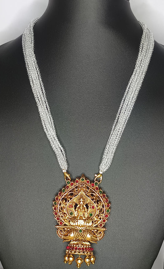 This gold plated chain boasts a stunning, ethinic design, making it the perfect accessory for parties, formal events, or temple visits. Adorned with sparkling white stones, it adds a touch of elegance to any outfit. Elevate your style with this versatile and eye-catching piece.