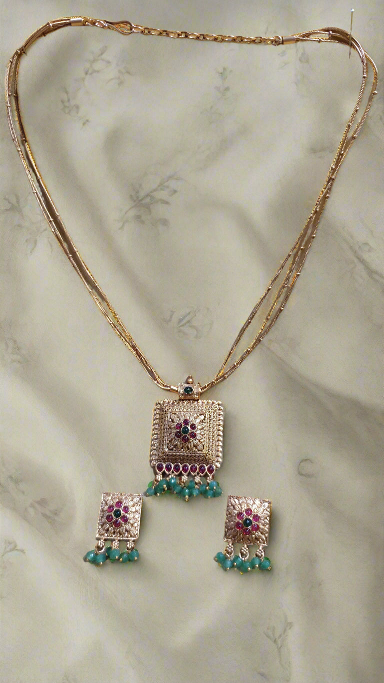 Add a touch of ethnic charm to any outfit with this 3-layered gold chain, featuring a beautiful pendant adorned with ruby and emerald stones. Perfect for parties, guests, and temple visits, this versatile piece is a stunning addition to your jewelry collection.