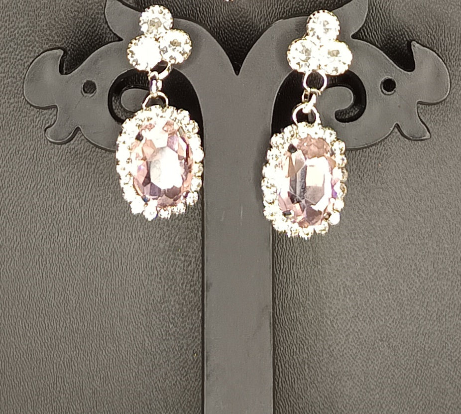 Rhodium-Plated Silver Toned American Diamond Necklace with earrings-Big stone pattern with pendent-pink