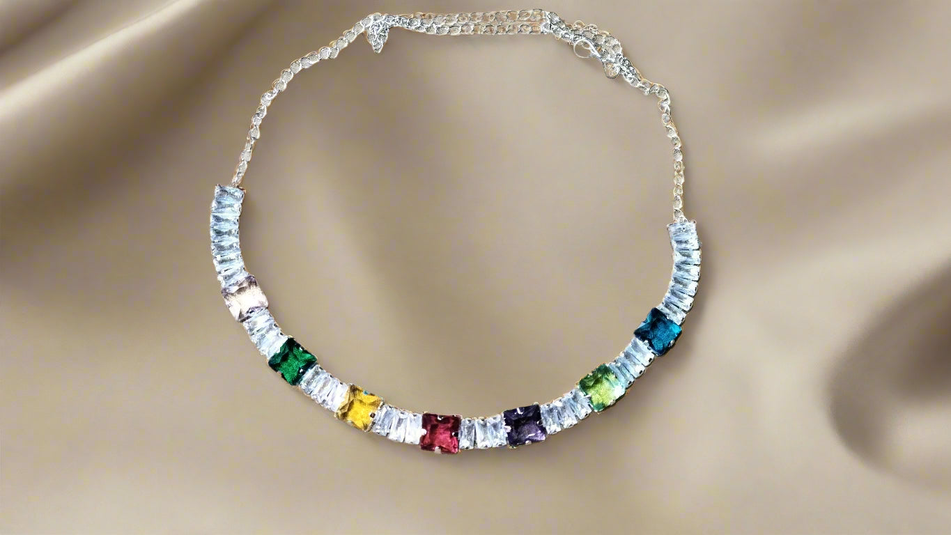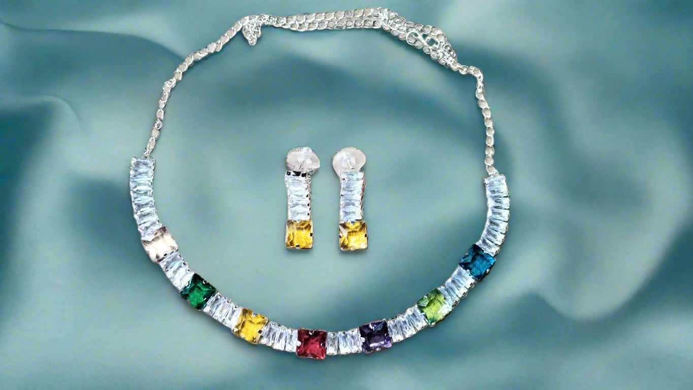 Enhance your style with our Multicolor Gleaming Rhodium Plated Necklace set, designed for the fashionable and confident woman. The set features a red stone pattern and adds an elegant touch of ethnicity to any outfit. Perfect for making a statement at the office, parties, or special events.