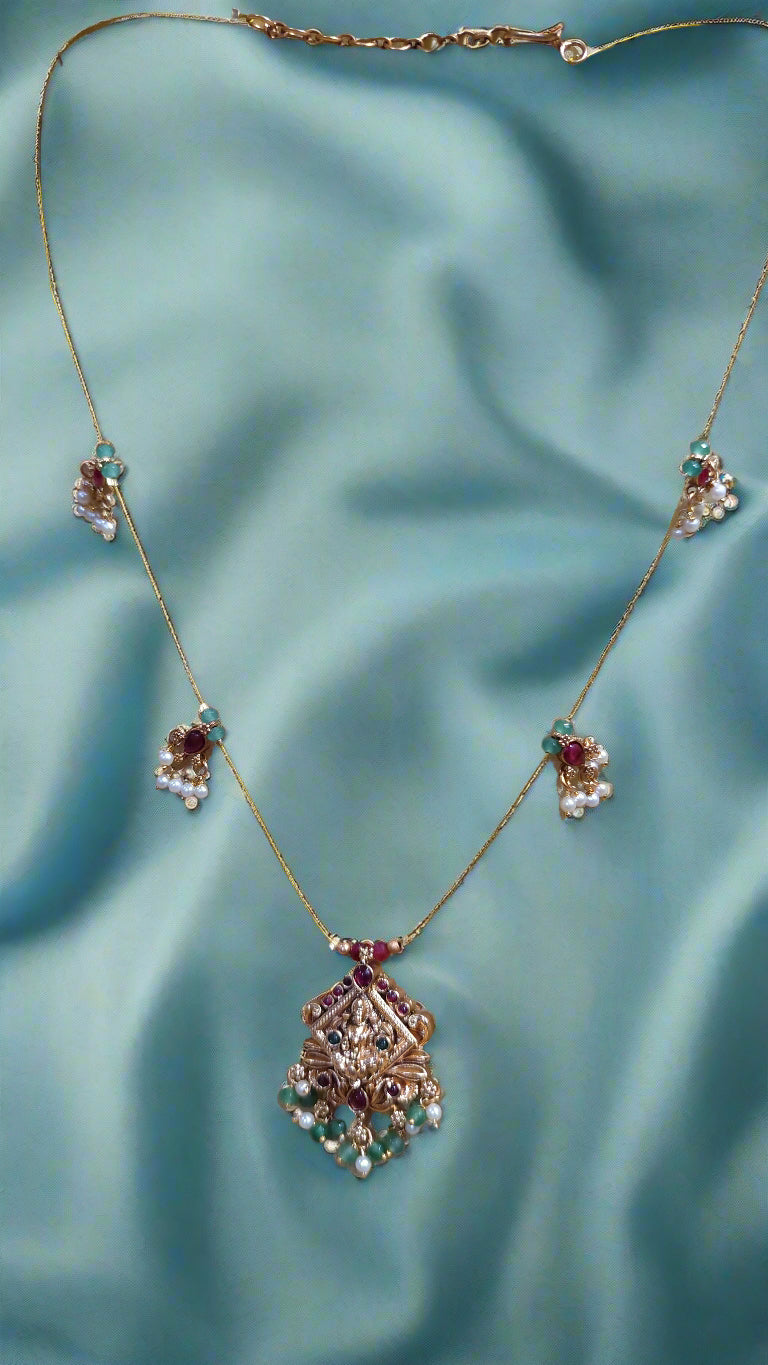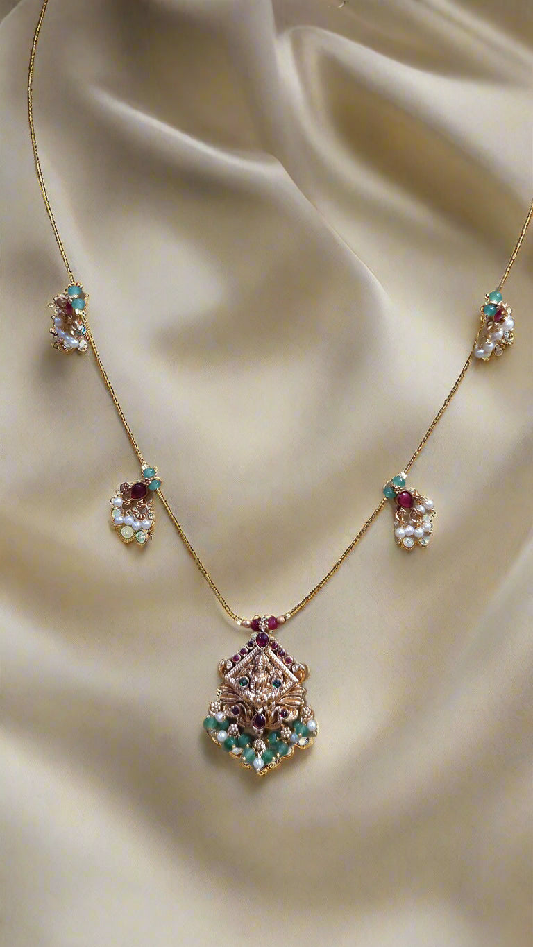 Add a touch of ethnic charm to any outfit with this Invisible Gold Chain with pendent and ruby and Emerlad with pearls Perfect for parties, guests, and temple visits, this versatile piece is a stunning addition to your jewelry collection.