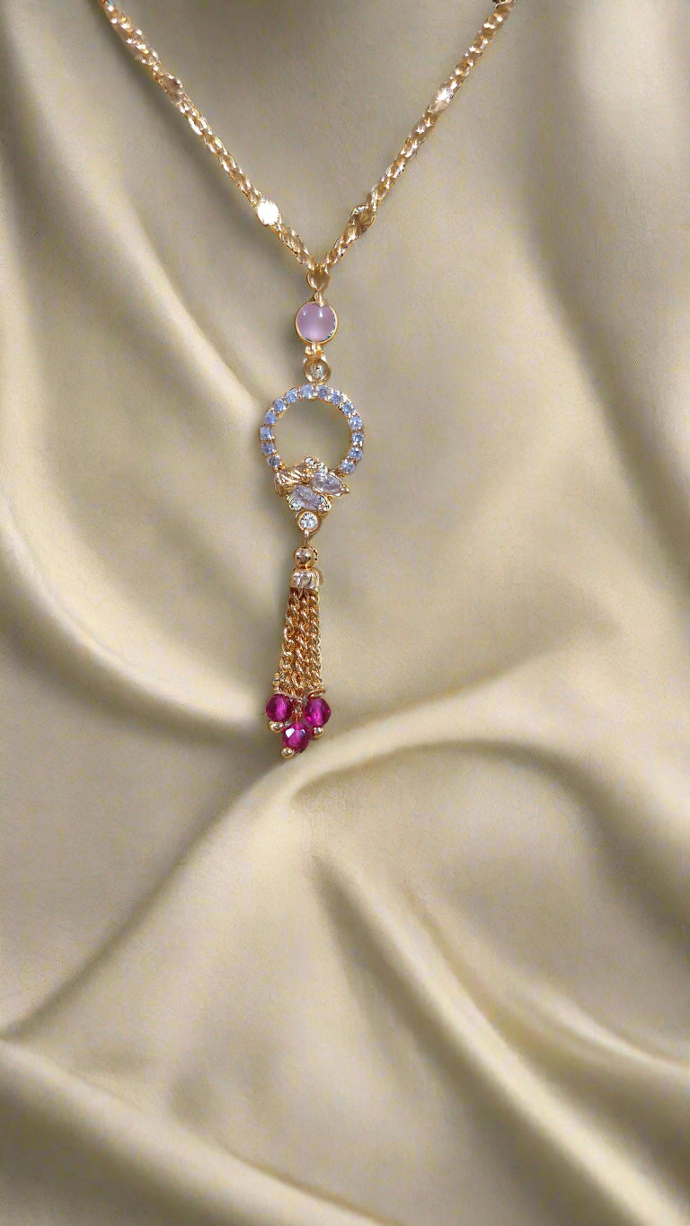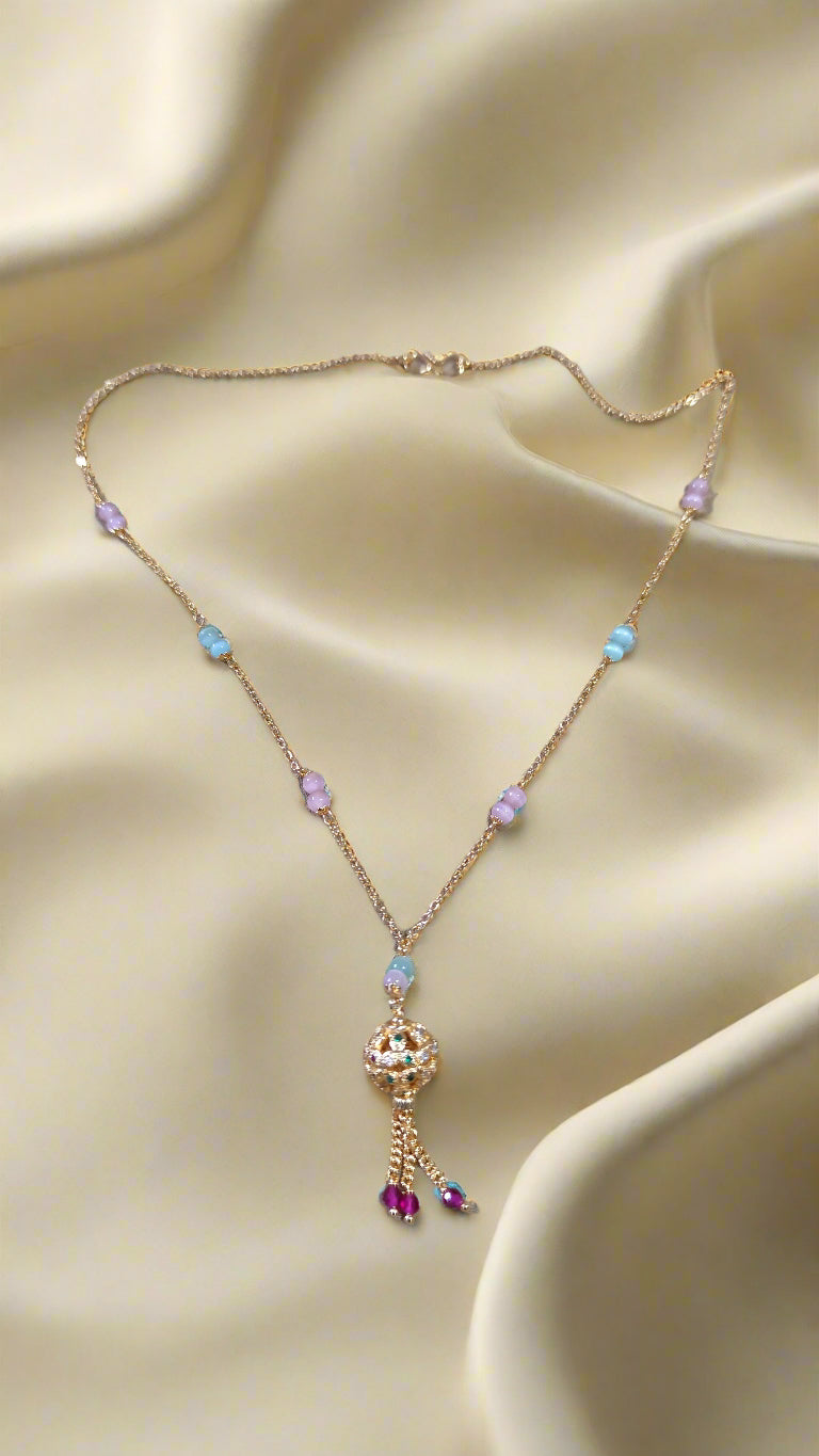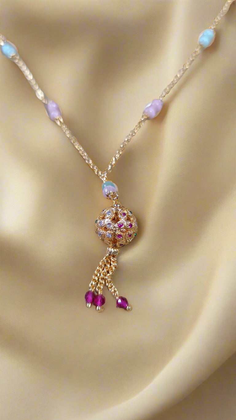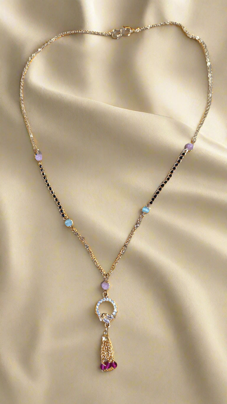 Upgrade your jewelry collection with this versatile Mangalsutra light weigth Gold Chain and gorgeous pendent, delicately crafted with white, ruby, and emerald stones. Perfect for any occasion, whether it's for the office, parties, or temple visits, this elegant chain adds a touch of ethnic charm to any outfit.