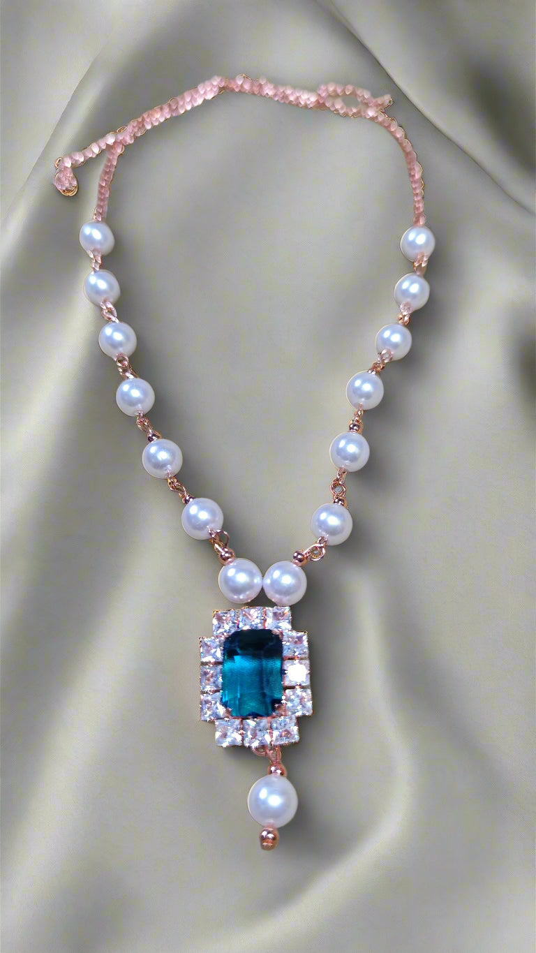 Enhance any ensemble with cultural charm with this Emerald green american diamond stone set Pearl necklace. Ideal for social events, visitors, and religious excursions, this exquisite piece adds a versatile and captivating touch to your jewelry assortment. Showcasing a gold-toned chain and a striking pendant adorned with emerald, ruby, and pearl accents, this necklace emits a royal and refined vibe. Meticulously designed in the traditional Victorian fashion, it's an excellent means to elevate the elegance of any event.