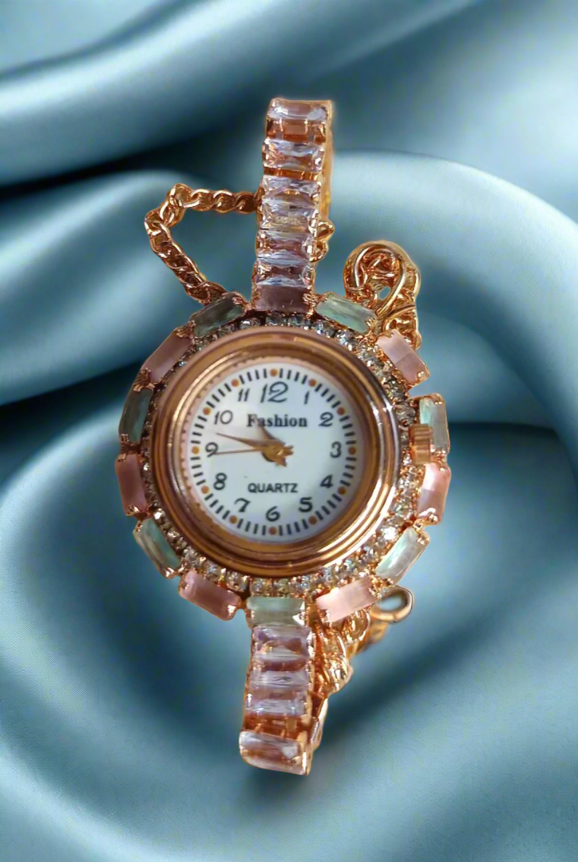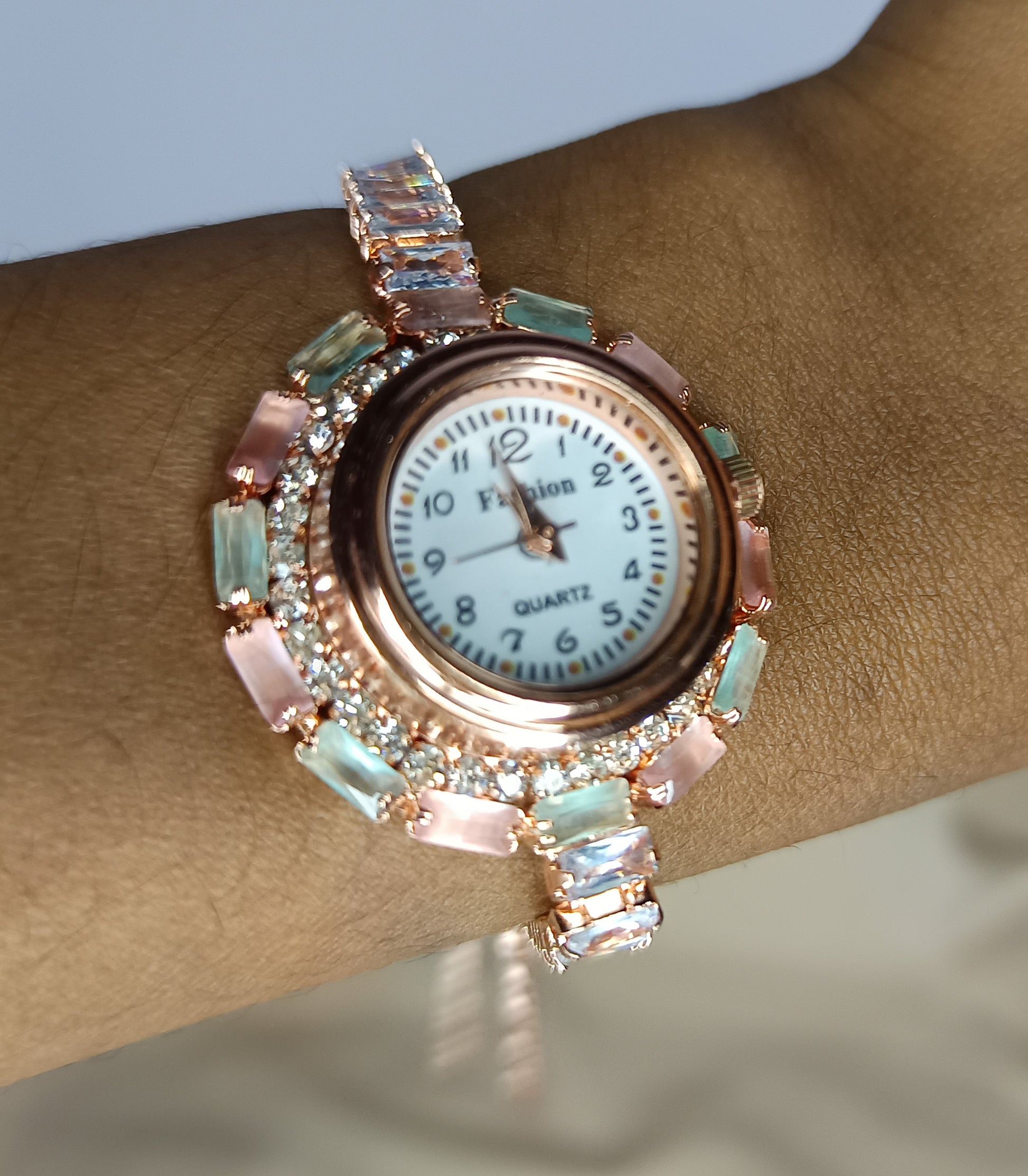 Elegant Rose metal Watch Bracelet with White, Paster Green and Pink stone Braceletwith Pastel green and Pastel Pink stones