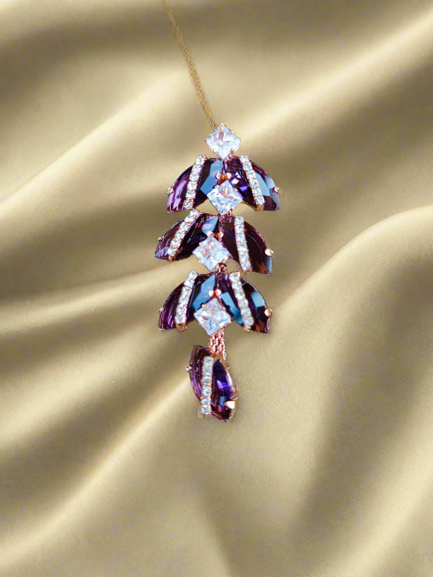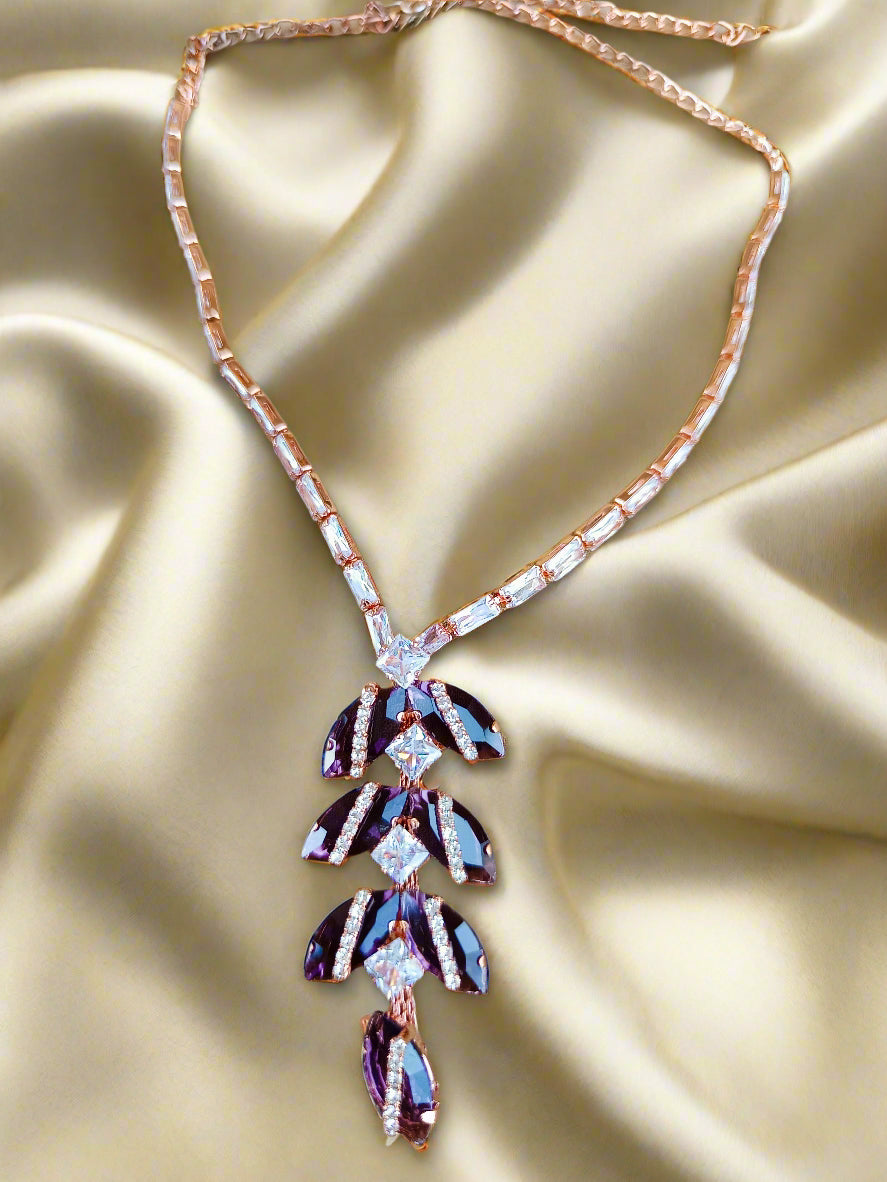 Crafted from high-quality materials, this elegant Rose Gold-Plated amethyst purple stone Chain set exudes sophistication and versatility. Perfect for office, parties, or as a guest, this chic set is a must-have for fashion-forward individuals who seek to elevate their style. With its striking Big green emerald stone, it adds a touch of glam to any outfit.